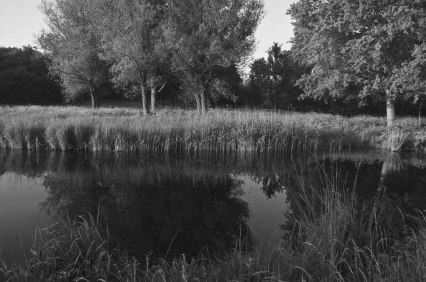 On the grass by the still lake